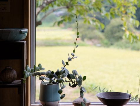 中山町佐礼谷ののどかな山あいの風景に溶け込む、陶房kibiの工房兼ショップ。お茶碗の形をくり抜いた、おしゃれな看板が目印です。「自分が使いたいものを作る」という窯主・梶原さんが手がける作品は、皆さんが想像する”砥部焼き”のイメージとは違う、おしゃれで独創的なデザインです。